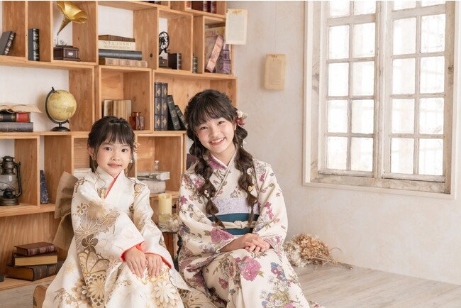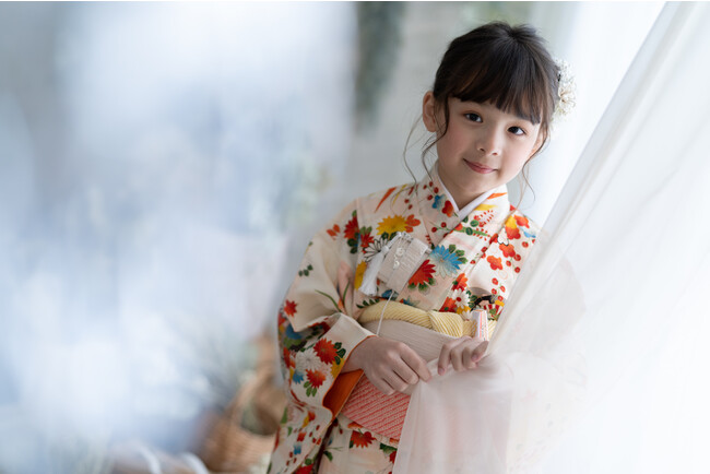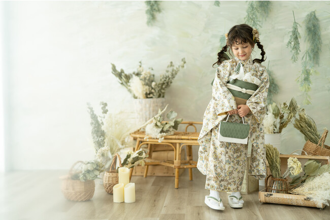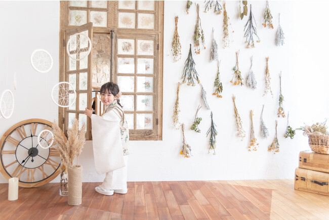 ナチュラルな印象で人気のコフレオリジナルお着物に加え、日本古来の伝統あるヴィンテージのお着物も柔らかなスタジオセットに一層映え、お子さまの晴れの日を華やかに彩ります。