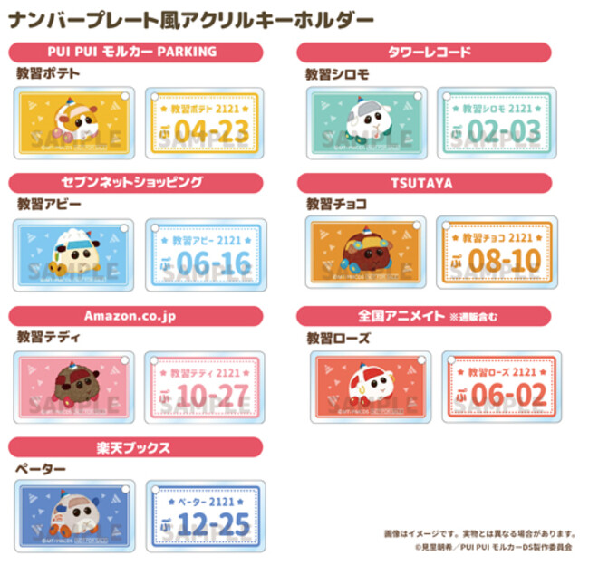 対象店舗にて『PUI PUI モルカーDRIVING SCHOOL』Blu-ray、DVD(SNS風クリアカード7枚セット付DVD含む)のいずれかをご購入いただいた方に、「ナンバープレート風アクリルキーホルダー」もしくは「教習ポテト証明写真風ステッカー」がプレゼントされます。