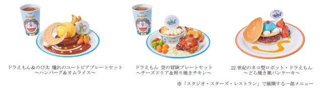 『映画ドラえもん のび太と空の理想郷(ユートピア)』に登場する、空の理想郷“パラダピア”を冒険しているドラえもんとのび太たち、そして、映画オリジナルキャラクターのパーフェクトネコ型ロボット“ソーニャ”の大きなイラストが描かれ、パーク内でも注目を集める「スタジオ・スターズ・レストラン」では、映画に登場する空に浮かぶ三日月型の理想郷“パラダピア”を表現したハンバーグ&オムライスのプレートや、ふわふわ雲をイメージしたソースに浮かぶ小型飛行機を操縦するドラえもんがかわいらしい、チーズドリア&照り焼きチキンプレート、そのほか、ドラえもんの大好物“どら焼き”をモチーフにしたパンケーキなど、ワクワクするオリジナルメニューが盛りだくさん!