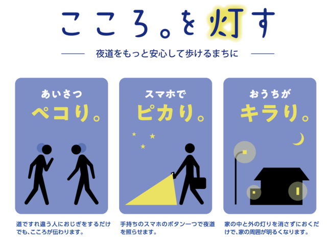 「こころ。を灯す」の企画は、『「高座」のこころ。』の推進にあたり、寒川町役場内にある寒川町ブランドのプロジェクトチームが、「安心」をキーワードに寒川町役場職員約300人に調査を実施したところ、町内を夜間に移動する際に不安を感じる声が多いことがわかり、これを受けて、「夜道をもっと安心して歩けるように」との想いから、自分とその周りの人の安心感や犯罪・事故防止に効果的な3つのアクションを企画しました。