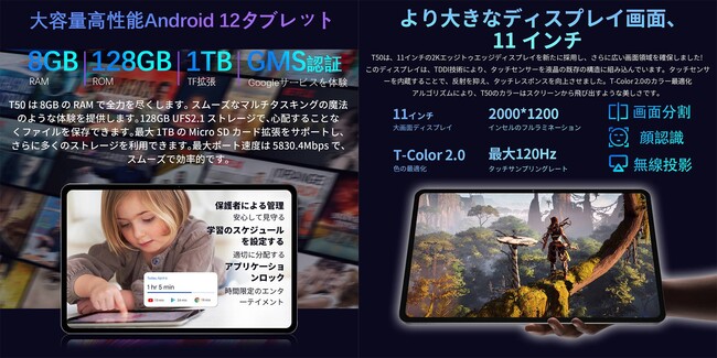 Teclast「T50」は、更に大きな11インチ2kのスディスプレイを使用して、より広い画面領域を提供できます。TDDIテクノロジーが利用されたディスプレイは、タッチセンサーをLCDの既存の構造に統合します。反射を減らし、タッチ応答性を向上させます。また、T-Color 2.0カラー最適化アルゴリズムにより、より鮮やかでリアルな色が表示されます。