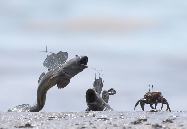 エピソード:有明海に面した干潟では、だれでも耳にしたことのある、有名なムツゴロウが沢山生息していますが、ほかにも干潟にはムツゴロウだけでなく、カニなど他の生物も沢山生息しています。この写真は、干潟のあちこちで繰り広げられている、ムツゴロウの激しい縄張り争いの場面ですが、すぐヨコでまるで行司のように見ているカニがいることで、ユーモラスで楽しいシーンになりました。