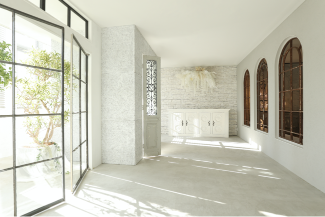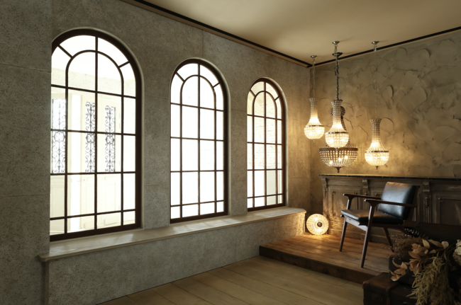3連のアーチ窓と5つのクラシックシャンデリアが圧巻のアンティークスタジオは光の加減で明暗使い分けた撮影ができます。