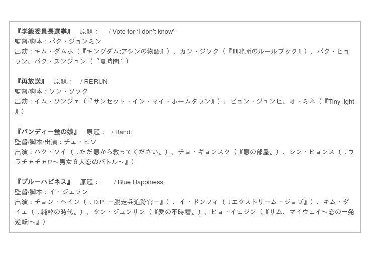 数々の作品で活躍し異なる個性を持つ、パク・ジョンミン(『空と風と星の詩人〜尹東柱の生涯〜』『地獄が呼んでいる』)、ソン・ソック(『マザー』『最高の離婚』)、チェ・ヒソ(『金子文子と朴烈』『アジアの天使』)、イ・ジェフン(『BLEAK NIGHT 番人』『シグナル』)が監督した各作品には、ベテランの演技派俳優から新鮮な魅力を持つ新人俳優まで、韓国映画界の今と未来を担う俳優(アーティスト)たちが出演する。