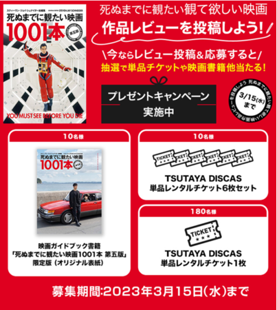 その他、「死ぬまでに観たい、観て欲しい映画」レビュー投稿キャンペーンでは、レビュー投稿&応募すると、抽選で名作映画ガイドの決定版「死ぬまでに観たい映画1001本」や、TSUTAYA DISCASで使える宅配レンタルチケット等プレゼントいたします。あなたのイチオシの作品についてレビューを書いてみませんか?奮ってご応募をお待ちしております。