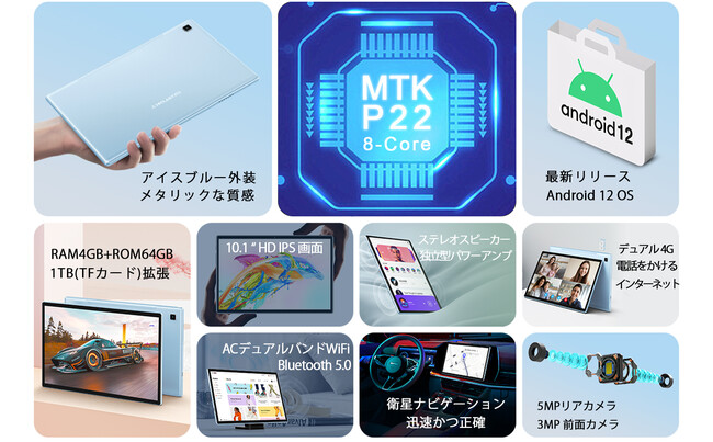 Amazon Android 12 タブレット P20S Media Tek製P22オクタコアプロセッサーを搭載ています。最先端の12nmプロセスにコアパイロット技術を加え、2.0GHzの高性能と高い周波数を維持しながら、低消費電力と低発熱を実現し、終始持続的な高性能と信頼性の高いユーザ体験を提供しています。