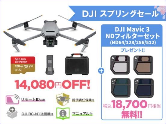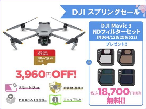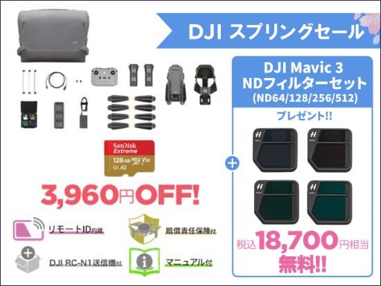 セキドオリジナルセットを含む Mavic 3 ご購入で、18,700円相当のDJI純正NDフィルターセットプレゼント!