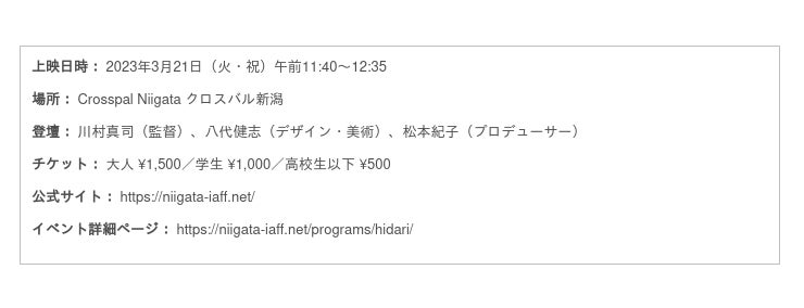 2023年3月17日(金)〜3月22日(水)に開催される「第1回 新潟国際アニメーション映画祭」にて、『HIDARI』(パイロット版)上映&トークショーを実施いたします。