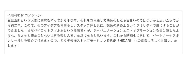 今後は、「第1回 新潟国際アニメーション映画祭」での上映&トークショーや、ほぼ日が運営する「TOBICHI 東京」にて展示イベントを予定しています。また、グローバルクラウドファンディングサービス「Kickstarter」(http://bit.ly/hidari-kickstarter)でのサポーター募集など、海外展開へ向けたプロジェクトも同時に始動。先行公開にてパイロットフィルムを観た細田 守氏や堤 大介氏、佐渡島庸平氏など各界の著名人からは、映画化に向けた期待の声が多く寄せられています。