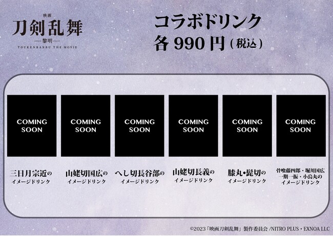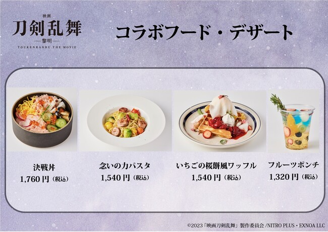 このカフェでは、『映画刀剣乱舞-黎明-』をイメージしたフード&スイーツや、本作に登場する刀剣男士をイメージしたドリンクを提供いたします。