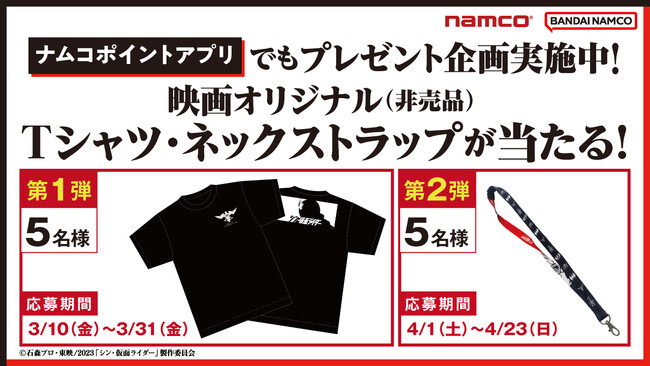 さらに、スマートフォン向けアプリ「ナムコポイントアプリ」でも、プレゼントキャンペーンを実施します。アプリ内のプレゼント応募ページから応募をすると、「シン・仮面ライダー」Tシャツ(Lサイズ)、「シン・仮面ライダー」ネックストラップが各5名さまに当たります。