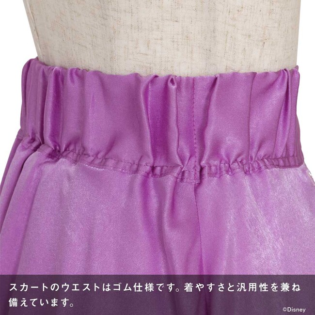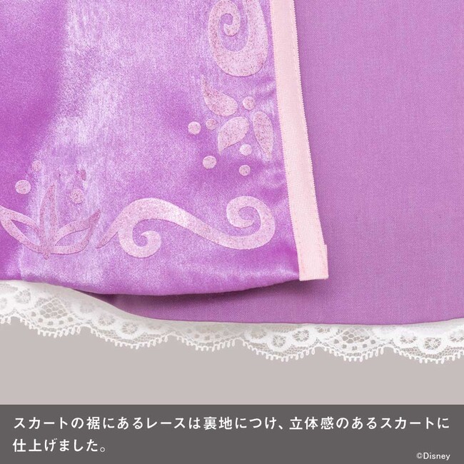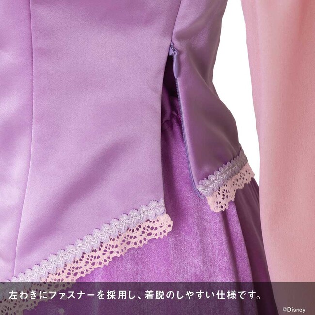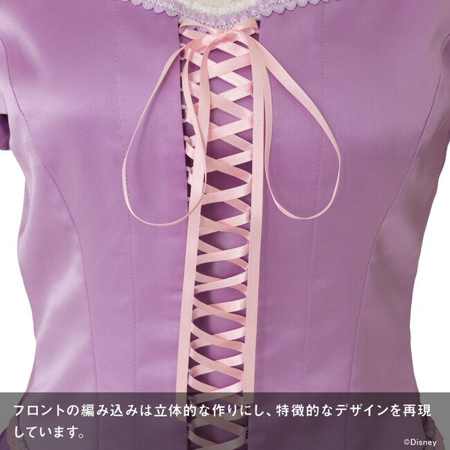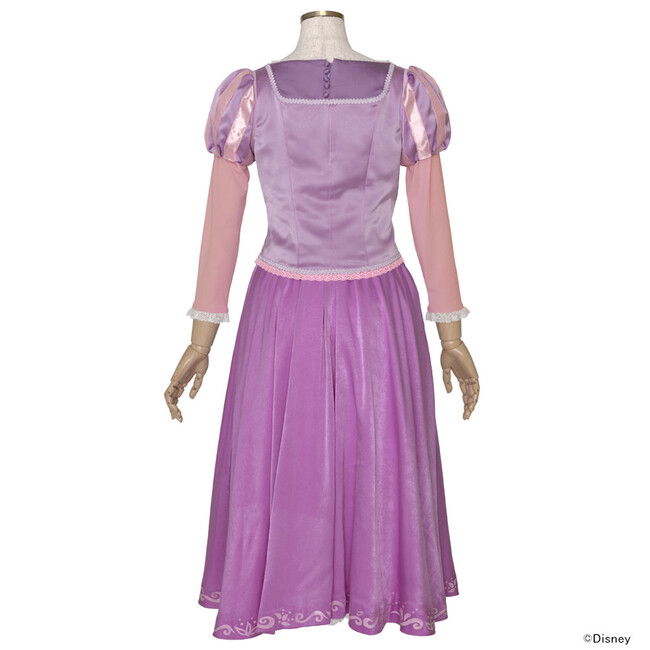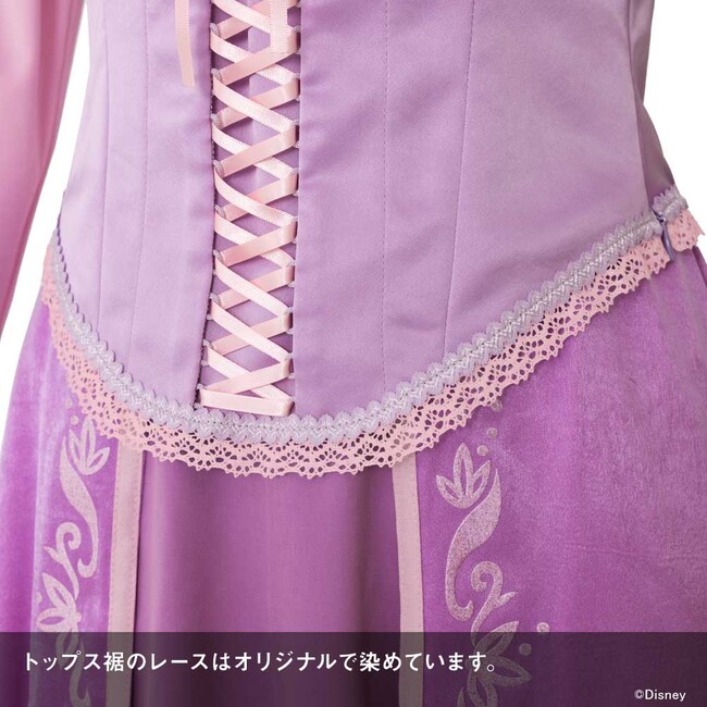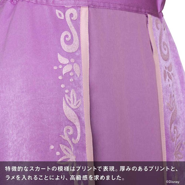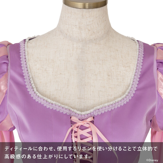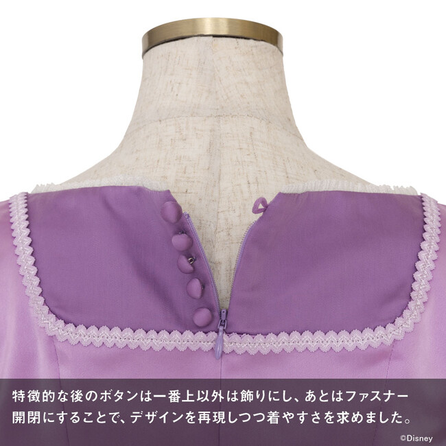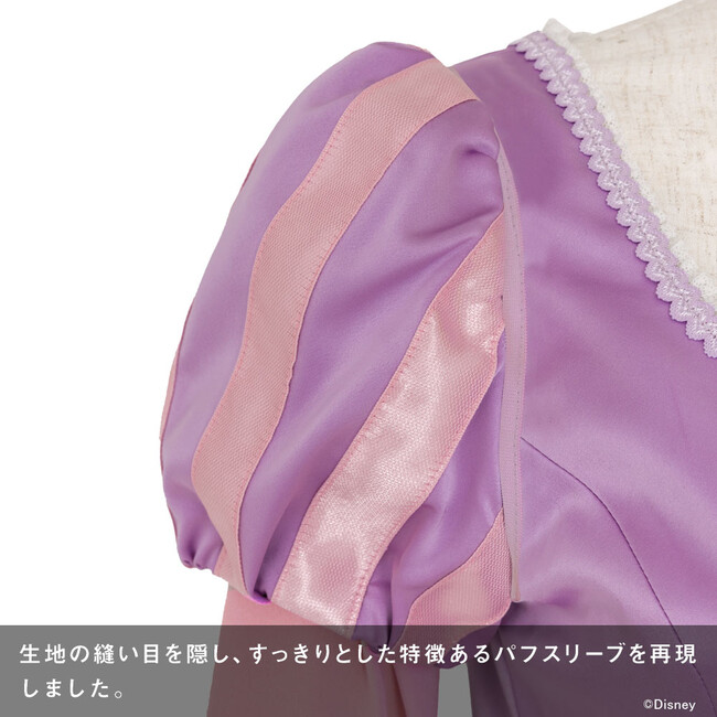 そんな天真爛漫で好奇心旺盛なラプンツェルが着用しているドレスを再現するために、特徴的なパフスリーブに大きく開いた胸元、ウエストはキュッと絞り、腰から裾にかけてフワッとボリュームのあるオーセンティックなデザインを採用しています。