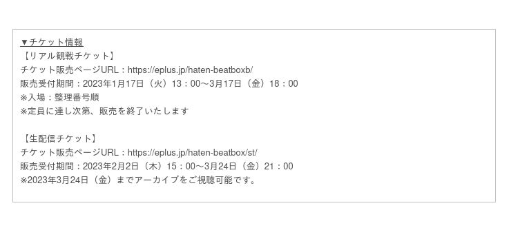 販売ページURL:https://eplus.jp/haten-beatboxb/