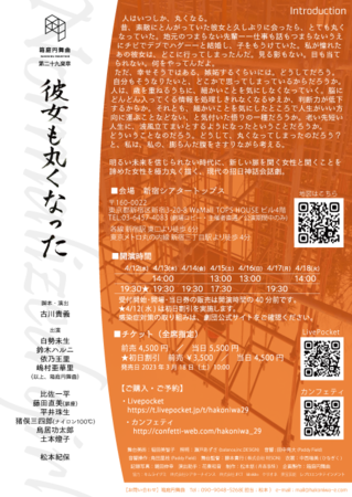 箱庭円舞曲 第二十九楽章『彼女も丸くなった』が2023年4月12日(水)〜18日(火)に新宿シアタートップス(東京都新宿区新宿3丁目20-8 TOPS HOUSE 4F)にて上演されます。チケットはカンフェティ(運営:ロングランプランニング株式会社、東京都新宿区、代表取締役:榑松 大剛)にて3月18日(土)10:00より発売開始です。