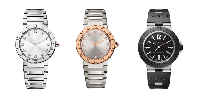 右:「ブルガリ アルミニウム」アルミニウム x ラバー x チタニウム、自動巻ムーブメント、100m防水