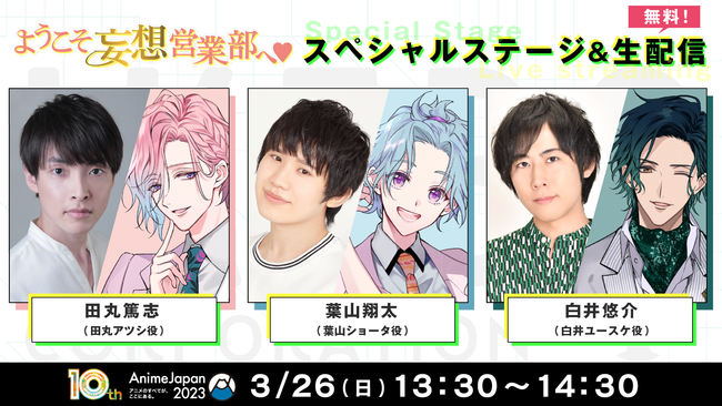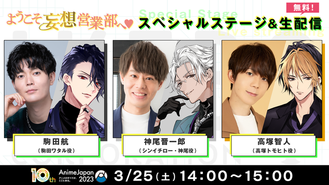 「ようこそ妄想営業部へ(ハート)」から駒田航、神尾晋一郎、高塚智人、田丸篤志、葉山翔太、白井悠介がAnimeJapan2023に登場し、Twitter LIVE & YouTubeで生配信!