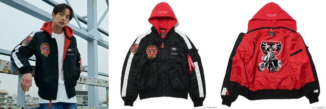 劇中スーツからインスパイアされた、本体色ブラックに内側がホワイトのカラーリング。フロント部分、右袖のエンブレムパッチが『シン・仮面ライダー』の世界観を演出。内側背面には、仮面ライダーとサイクロン号をプリント。また、左胸の面ファスナー”ALPHA INDUSTRIES”レザーワッペンを取り外すと「T.HONGO」の文字が現れる仕様となっています。
