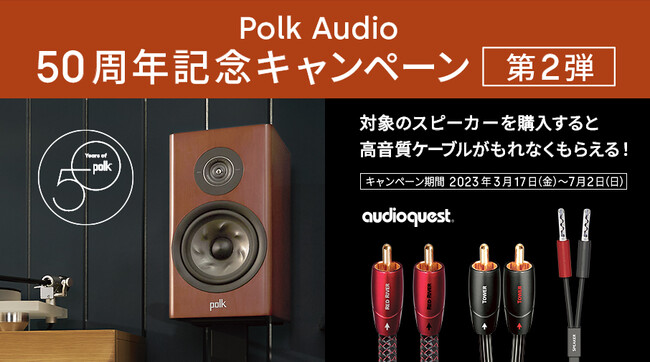 株式会社ディーアンドエムホールディングスは、2023年3月17日(金)より「Polk Audio 50周年記念キャンペーン第二弾」を実施することをお知らせいたします。Polk Audioの50周年記念モデル「R200AE」または「Reserveシリーズ」、「Signature Eliteシリーズ」のステレオスピーカーをキャンペーン期間中にご購入の上、キャンペーンにご応募いただいた方全員にAudioQuest の高音質スピーカーケーブル、またはオーディオケーブルをプレゼントいたします。