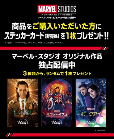 展示会場にてグッズを購入された方へ ディズニープラスで配信中のマーベル・スタジオ オリジナル作品 ステッカーカードを1枚プレゼントいたします!カードは全部で3種類。