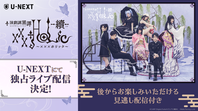 USEN-NEXT GROUPの株式会社U-NEXT(本社:東京都品川区、代表取締役社長:堤 天心)が運営する動画配信サービス「U-NEXT」は、2023年4月7日(金)より開催される『演劇調異譚「xxxHOLiC」 -續-』を独占でライブ配信することを決定いたしました。ライブ配信の対象となるのは、4月7日(金)18:00公演<初日公演>、5月7日(日)13:00公演/18:00公演<千秋楽公演>の計3公演です。
