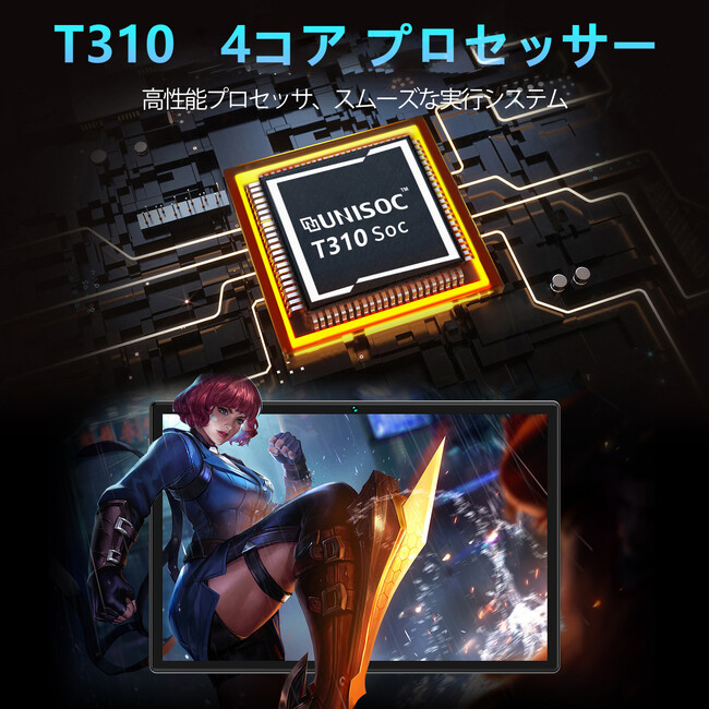 【高性能4コアCPU+4GBRAM+64GBROM+高性能プロセッサ】タブレットUNISOC T310セッサを搭載しています。12nmプロセスルールを利用して製造されUNISOC T310は、高性能な「A75(2.0Ghz)」コアと三つの高効率な「A55」コアを搭載し、AnTuTu実行ポイントも150,000を超えます。安定性が高くスムーズな処理を実現し操作がサクサクスピーディーに行えます。