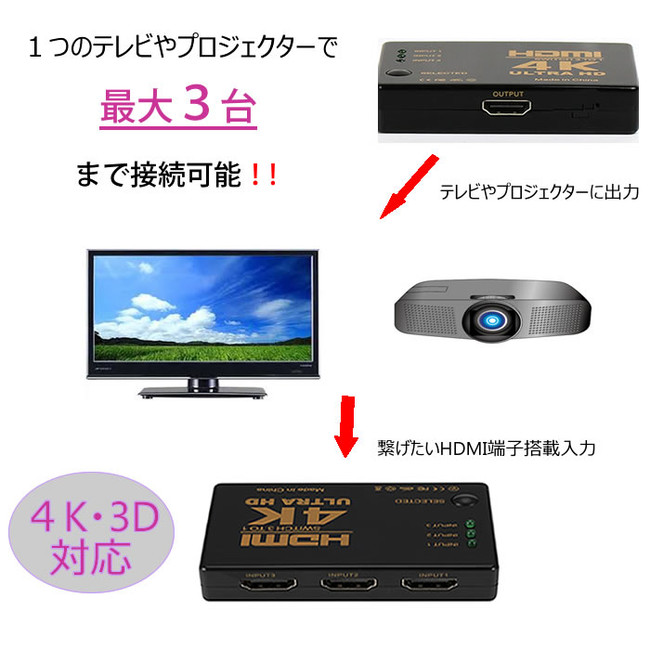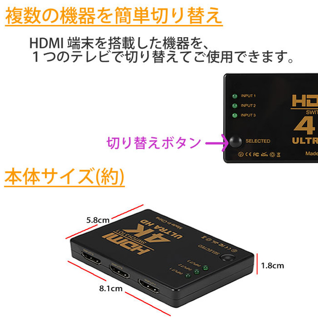 4K対応 HDMI セレクター 分配器 切替器 高画質 3D対応 hdmi切り替え 3ポート 4K セレクター切り替え PS4 Nintendo Switch ゲーム機【gi-HM-001】