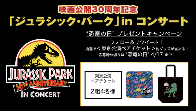 映画公開30周年記念「ジュラシック・パーク」inコンサートの開催を記念し、4月17日=恐竜の日まで、SNSプレゼントキャンペーンを開催します!参加してくださった方の中から抽選で「ジュラシック・パーク」inコンサートのチケットなどをプレゼント!ぜひご参加ください!
