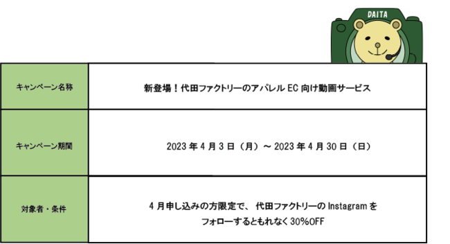 株式会社代田ファクトリー(本社:東京都杉並区、代表取締役:熊谷俊明)は、ECやSNSでご利用いただける アパレル向け動画サービスを2023年4月3日(月)より開始いたします。