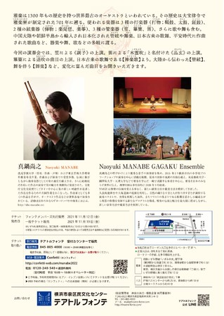 Naoyuki MANABE GAGAKU Ensemble主催による、Naoyuki MANABE GAGAKU Ensemble 〜管絃と舞楽の世界〜『レクチャー&コンサート 雅楽 新春の調べ』が2022年2月12日 (土)に横浜市泉区民文化センター テアトルフォンテ ホール(神奈川県横浜市)にて上演されます。チケットはカンフェティ(運営:ロングランプランニング株式会社、東京都新宿区、代表取締役:榑松 大剛)にて発売中です。