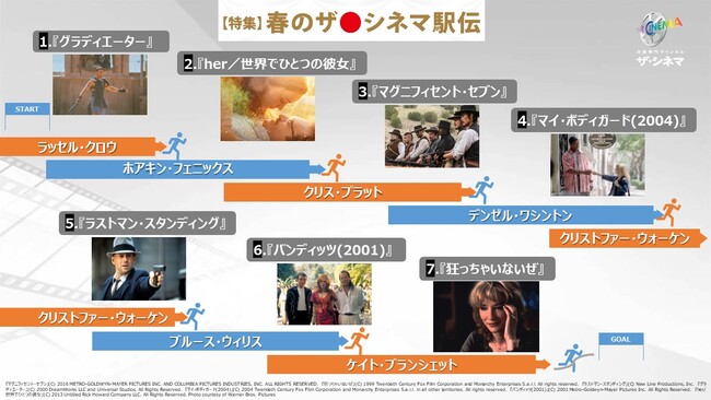 洋画専門CS放送ザ・シネマでは、出演俳優をタスキ代わりに“映画の輪”を繋げる、「ザ・シネマ駅伝」を開催いたします。俳優を共通項に繋がっている作品を4月10日(月)〜16日(日)の期間に毎日1作品ずつ、計7作品をお届けいたします。