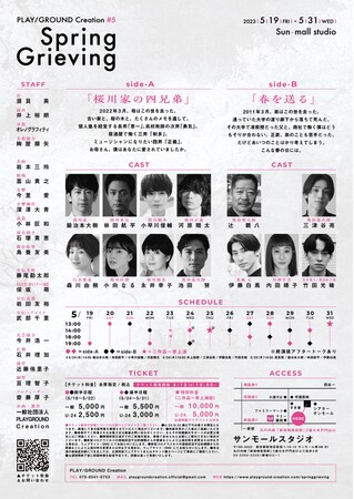 俳優・演出家の井上裕朗が代表を務めるPLAY/GROUND Creationの新作、PLAY/GROUND Creation #5『Spring Grieving』が2023年5月19日 (金) 〜2023年5月31日 (水)にサンモールスタジオ(東京都新宿区新宿1丁目19-10 サンモール第3M-B1)にて上演されます。 チケットはカンフェティ(運営:ロングランプランニング株式会社、東京都新宿区、代表取締役:榑松 大剛)にて4月15日(土)10:00より発売開始です。