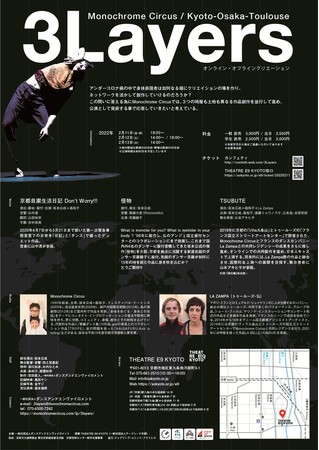 一般社団法人 ダンスアンドエンヴァイロメント(京都府京都市、代表:坂本公成)主催による、Monochrome Circus/Kyoto-Osaka-Toulouse オンライン・オフラインクリエーション『3 Layers』が2022年2月11日 (金・祝) 〜2022年2月13日 (日)にTHEATRE E9 KYOTO(京都府京都市)にて上演されます。チケットはカンフェティ(運営:ロングランプランニング株式会社、東京都新宿区、代表取締役:榑松 大剛)にて12月24日(金)より発売開始です。
