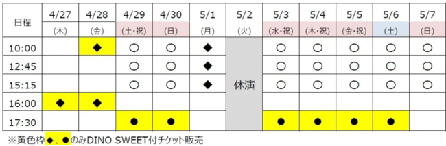 ※黄色枠の◆、●のみDINO SWEET付チケット販売