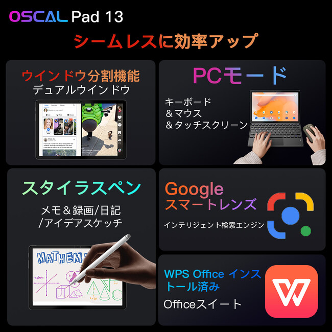 Oscal Pad 13は、ワイヤレスキーボードやマウスと連携するPCライクなWPS OfficeソフトウェアによるPCモードを提供し、Windowsライクなデスクトップオフィス体験をタブレットで楽しむことができます。