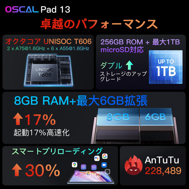Oscal Pad 13は、Unisoc T606プロセッサーとMali-G57のGPUを搭載し、要求の厳しいオンラインゲームを簡単に実行できるほどパワフルとのことです。