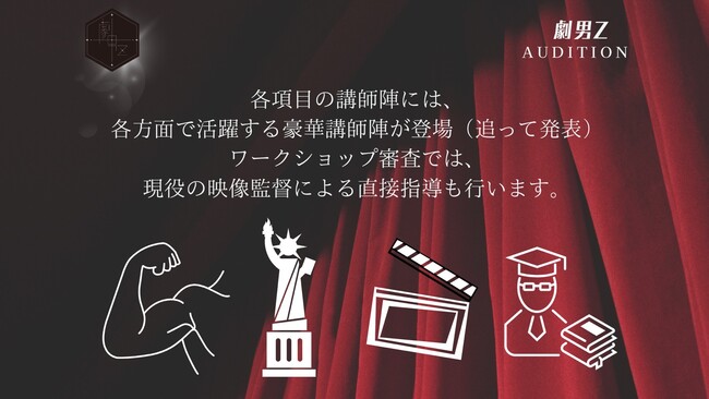 書類審査・二次面談審査を突破すると、各方面で活躍する豪華講師陣を迎え(追って発表)ワークショップ審査や合宿審査を行います。審査の内容は各メディアやSNSなどで公開され、俳優陣の熱い闘いを見守ることができます。