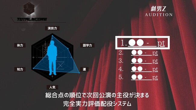 演技力・語学力・体力・知力・運・人気の6項目に沿って全て点数で勝負、1番になったものが主役の座を掴むことのできるガチンコバトル!