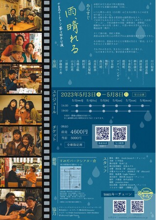 teamキーチェーン(代表:Azuki)主催、teamキーチェーン第18回本公演『雨、晴れる』が2023年5月3日 (水・祝) 〜2023年5月8日 (月)にすみだパークシアター倉(東京都墨田区横川1-1-10)にて上演されます。チケットはカンフェティ(運営:ロングランプランニング株式会社、東京都新宿区、代表取締役:榑松 大剛)にて発売中です。
