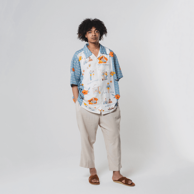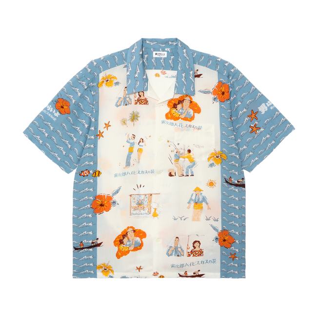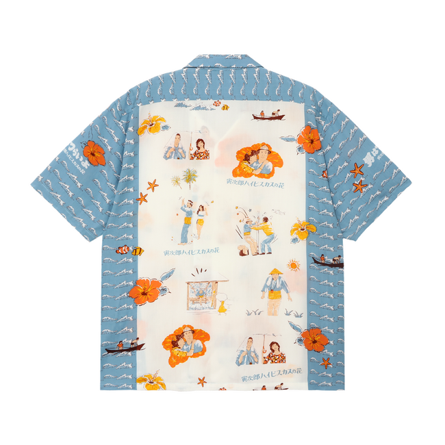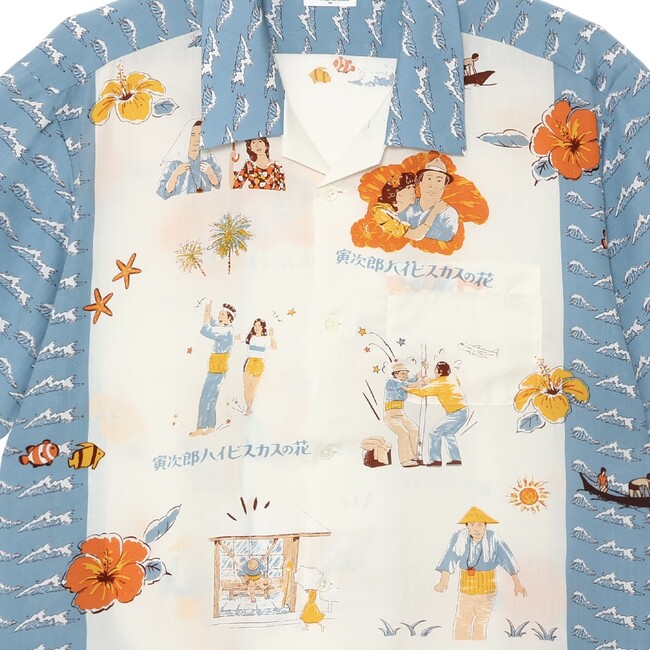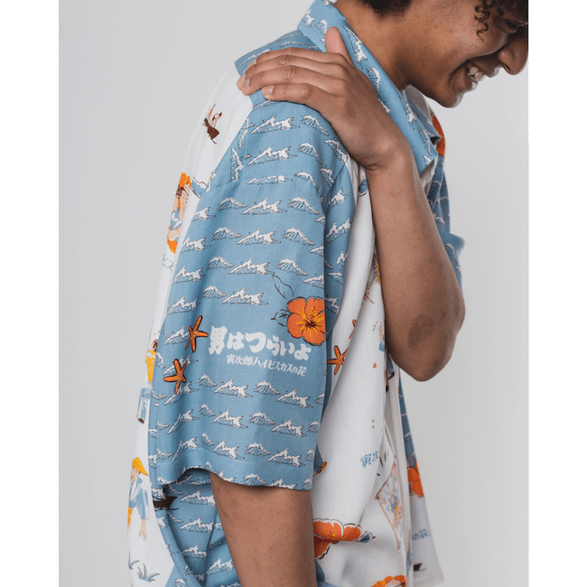Eanbeの故郷・沖縄を舞台にしたシリーズ第25作『寅次郎ハイビスカスの花』をテーマに、寅さんとリリー(浅丘ルリ子さん)が作中で織りなす名シーンを柔らかなタッチのイラストで再現。ハイビスカスや海のイラストによって沖縄らしさも加えた総柄のアロハシャツです。
