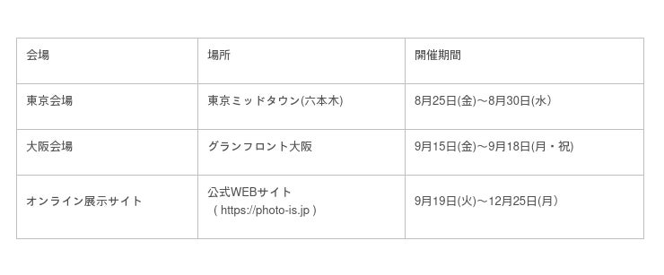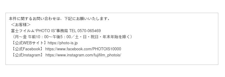 今年は新たに東京会場・大阪会場で、写真家・著名人によるトークショーや、家族・友人と一緒にお楽しみいただける、写真をテーマにしたワークショップ、撮影会などを開催します。さらに、当社のINSTAX“チェキ”やプリント製品などをお試しいただけるコーナーや展示など、終日お楽しみいただける企画を実施します。今後、「“PHOTO IS”想いをつなぐ。あなたが主役の写真展2023」の公式WEBサイト( https://photo-is.jp )で最新情報を随時公開していきます。 富士フイルムは、今後も多様化するお客様のニーズにお応えし、便利で付加価値の高い商品・サービスをご提供するとともに、「撮る、残す、飾る、そして贈る」という写真本来の価値を伝え続けていきます。 (※1) ご応募いただける作品は、各部門お1人様1会場につき1点です。1点ずつであれば、同一の作品、あるいは異なる作品を複数の会場に応募することも可能です。複数応募の場合、応募数分の専用応募台紙が必要です。社会通念上、明らかに公序良俗に反すると主催者が判断した作品は展示できません。 (※2) オンライン展示サイトでの公開を希望しない場合は、非公開にすることも可能です。「インスタグラム」部門の作品はオンライン展示の対象外です。 (※3)「“PHOTO IS”10,000人の写真展」としてスタート。 記