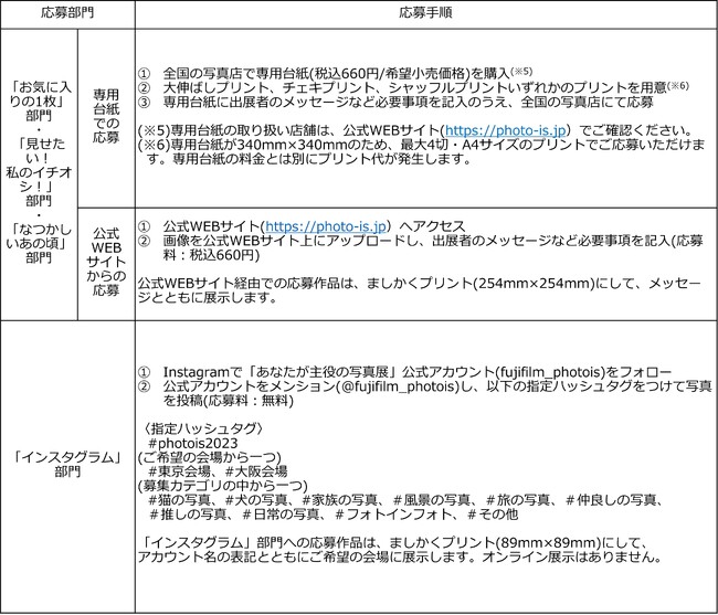 (4)「インスタグラム」部門 Instagramの「あなたが主役の写真展」公式アカウント(fujifilm_photois)をフォローの上、アカウントをメンションし、指定のハッシュタグをつけて写真を投稿するだけで、簡単に応募できる部門です。会場では、ましかくプリント(89mm×89mm)にした作品を展示します。 【「あなたが主役の写真展」公式アカウント】 https://www.instagram.com/fujifilm_photois/ 【指定のハッシュタグ】 #photois2023、作品の展示を希望される会場(#東京会場、#大阪会場)と、応募作品に合わせて以下の全10カテゴリの中からハッシュタグを一つ選んで投稿ください。 #猫の写真、#犬の写真、#家族の写真、#風景の写真、#旅の写真、#仲良しの写真、#推しの写真、 #日常の写真、#フォトインフォト(※4)、#その他 (※4) 好きな風景などを背景にして写真プリントを掲げて撮影した写真