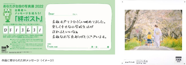 富士フイルムは、出展者全員の作品を、“写真に込められた想い”とともに展示する参加型写真展(※3)を2006年にスタートしました。昨年は、小さなお子さまから90歳以上の方まで幅広い年齢層からご応募いただき、約2万点の作品を展示。会場にお越しいただいた方より「写真プリントには、スマホなどの画面上で見る画像とは違った面白さがある」「少しの時間立ち寄るつもりだったが、思わず見入っていて、気付けば1時間以上写真を楽しんでいた」「やはり生で観る写真展がいい」などの声が寄せられ、写真が持つ価値や写真プリントの魅力を実感いただきました。 参加型写真展として17回目となる「“PHOTO IS”想いをつなぐ。あなたが主役の写真展2023」では、「見せたい!わたしのイチオシ!」部門を新設。現在熱中している趣味や紹介したい好きなものなどを写した作品を展示します。また、2018年に好評いただいた「なつかしいあの頃」部門を再度設け、出展者にとってなつかしい思い出の1枚を募集します。撮影のテーマやジャンルを問わず応募できる「お気に入りの1枚」部門、Instagramに画像をアップロードすることで簡単に応募できる「インスタグラム」部門を含め、計4部門で作品を募集します。 「想いをつなぐ」がテーマの「“PHOTO IS”想いをつなぐ。あなたが主役の写真展2023」では、来場者が、共感した作品に対する感想や想いを記した「絆メッセージ」を出展者に向けて投函できる「絆ポスト」を東京・大阪会場とオンライン展示サイトに設置。来場者から寄せられる「絆メッセージ」を開催終了後に出展者に郵送で届けます。出展者と来場者の間で交わされる、写真を通じたコミュニケーションで新たな“絆”を生み出していきます。