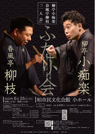 柏市民文化会館指定管理者ASTN共同企業体主催、『柳亭小痴楽・春風亭柳枝「二人会」』が2023年6月25日 (日)に柏市民文化会館 小ホール(千葉県柏市柏下107)にて開催されます。 チケットはカンフェティ(運営:ロングランプランニング株式会社、東京都新宿区、代表取締役:榑松 大剛)にて発売中です。