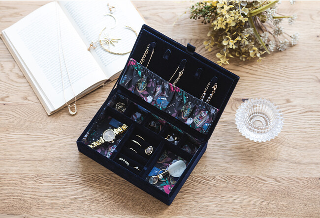 ネックレスを収納できる5本のフックと4個仕切りのリングホルダー、ピアス・イヤリングなどを小分けに収納できる仕切り付きで大切なアクセサリーを美しく収納してくれます。