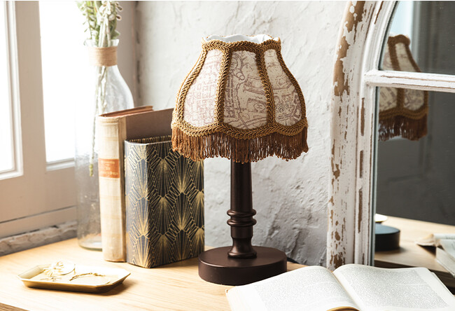 シェードのフリンジや縫い合わせや木製のスタンドが、より一層アンティーク感を演出します。