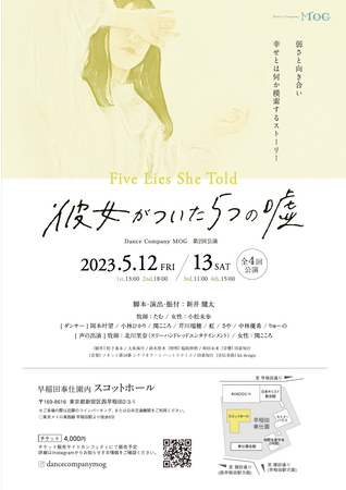 Dance Company MOG主催、『彼女がついた5つの嘘』が2023年5月12日 (金) 〜2023年5月13日 (土)に早稲田奉仕園スコットホール(東京都新宿区西早稲田2-3-1)にて上演されます。チケットはカンフェティ(運営:ロングランプランニング株式会社、東京都新宿区、代表取締役:榑松 大剛)にて発売中です。
