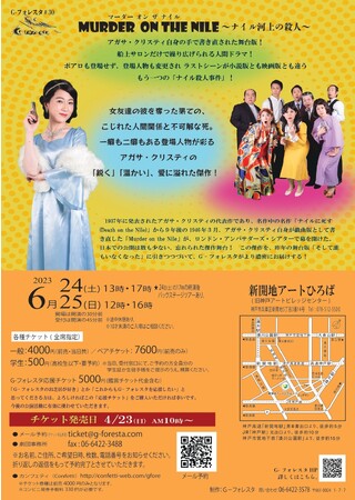 G-フォレスタ『Murder on the Nile 〜ナイル河上の殺人〜』公演期間:2023年6月24日 (土) 〜2023年6月25日 (日)会場:新開地アートひろば(兵庫県神戸市兵庫区新開地5丁目3番14号)■出演者生田克正、中佐和葉、もりかゆみ、森優子、山崎修一、泉希衣子、五馬さとし(ビックワンウエスト/劇団ひこひこ)、沢竜(イズム)、高田恵輔、伶原彩夏(シアワセナゲキダン)、谷屋俊輔(ステージタイガー)、渡部友実■スタッフ演出:丸尾拓舞台監督:久保克司 ((株)スタッフステーション)照明:溝渕功 (campana)音響:四之宮基貴(SAWCRNT)舞台美術:久太郎 (Anahaim Factory)衣装:山口明子受付:なつみあや、佐倉ハルキ 他宣伝写真:高田恵輔(Marble Plus)宣伝美術:スギモトヒロコ舞台撮影:佐伯亜由美(SEKpictures )制作:守家由美、森優子、中佐和葉企画・制作:G-フォレスタ■公演スケジュール6月24日(土)13:00 / 17:00★6月25日(日)12:00 / 16:00★終演後、バックステージツアー有※開場は、開演の30分前です。■チケット料金指定席引換券:4,000円(税込)