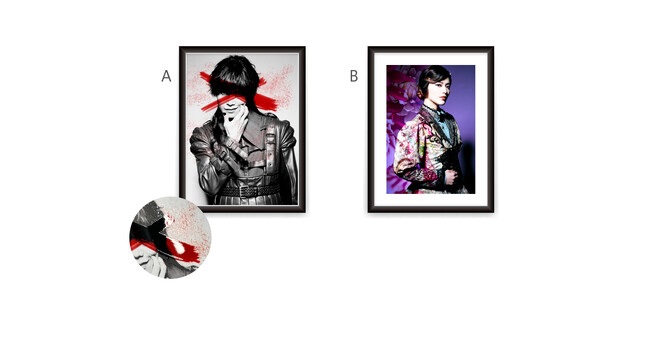 ※光沢エンボス加工ができる特殊プリント方式「グロスプリント」を、すべての額装フォトアートに採用。主にイラスト作品に用いられるこの方式を、ポートレイト写真と融合させることでHELI-Xの世界観を演出しています。会場で実際に見てお楽しみください。