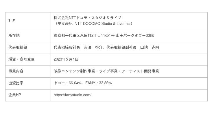 加えて、本業務提携に伴い、FANY Studioが第三者割当の方法により発行する株式をドコモが引き受けることとしました。FANY Studioは2023年5月1日(月)から、「株式会社NTTドコモ・スタジオ&ライブ」(以下、ドコモ・スタジオ&ライブ)として、映像コンテンツ制作事業、音楽をはじめとするライブ事業、アーティスト開発事業の3事業を開始いたします。