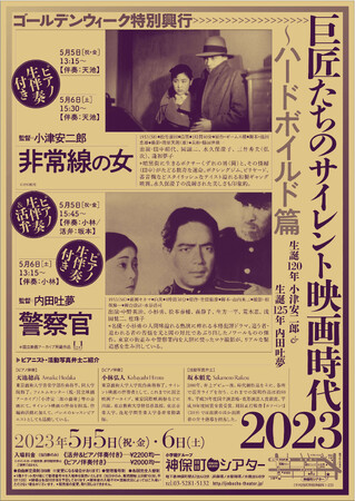 今回の上映は、ハードボイルド篇と銘打ち、今年生誕120年の小津安二郎監督作品『非常線の女』、生誕125年の内田吐夢監督作品『警察官』、共に1933年公開の人気作2本をお送りします。各作品2回ずつ、全4回の上映すべてにピアノの生伴奏が付き、5月5日(祝・金)『警察官』の上映には、周防正行監督作品『カツベン』で弁士指導を担当し、最近では東西の寄席の舞台でも注目されている活動写真弁士・坂本頼光氏による活弁が付きます!